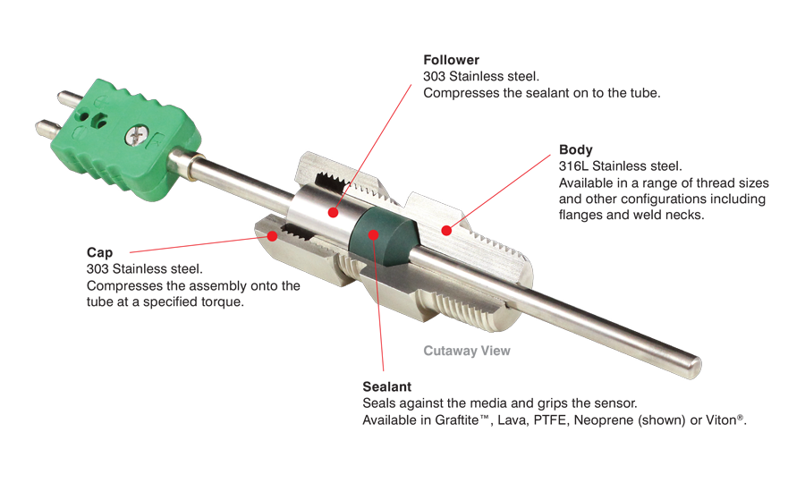 Common applications include sealing sheathed thermocouples and resistance thermometers, small-bore tubes and other types of sensor where they enter a process enclosure.