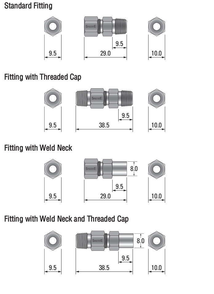 | 1/16" BSPT, 1/16" BSPP, 1/16" NPT | 3.2mm | 1/8" BSPT, 1/8" BSPP, 1/8" NPT | 4.76mm | 1/4" BSPT, 1/4" BSPP, 1/4" NPT | 6.35mm |